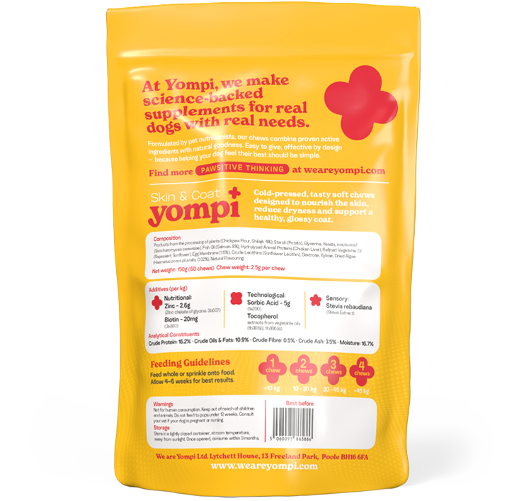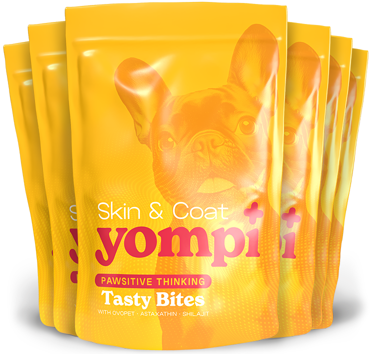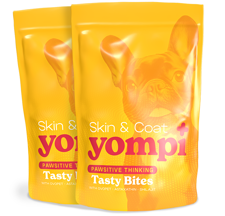 Give your dog a healthy, glossy coat from the inside out with Yompi's Skin & Coat chews. Packed with Zinc, Biotin, Omega-3, and Astaxanthin, these cold-pressed chews nourish the skin, reduce dryness, and support a vibrant, healthy coat.